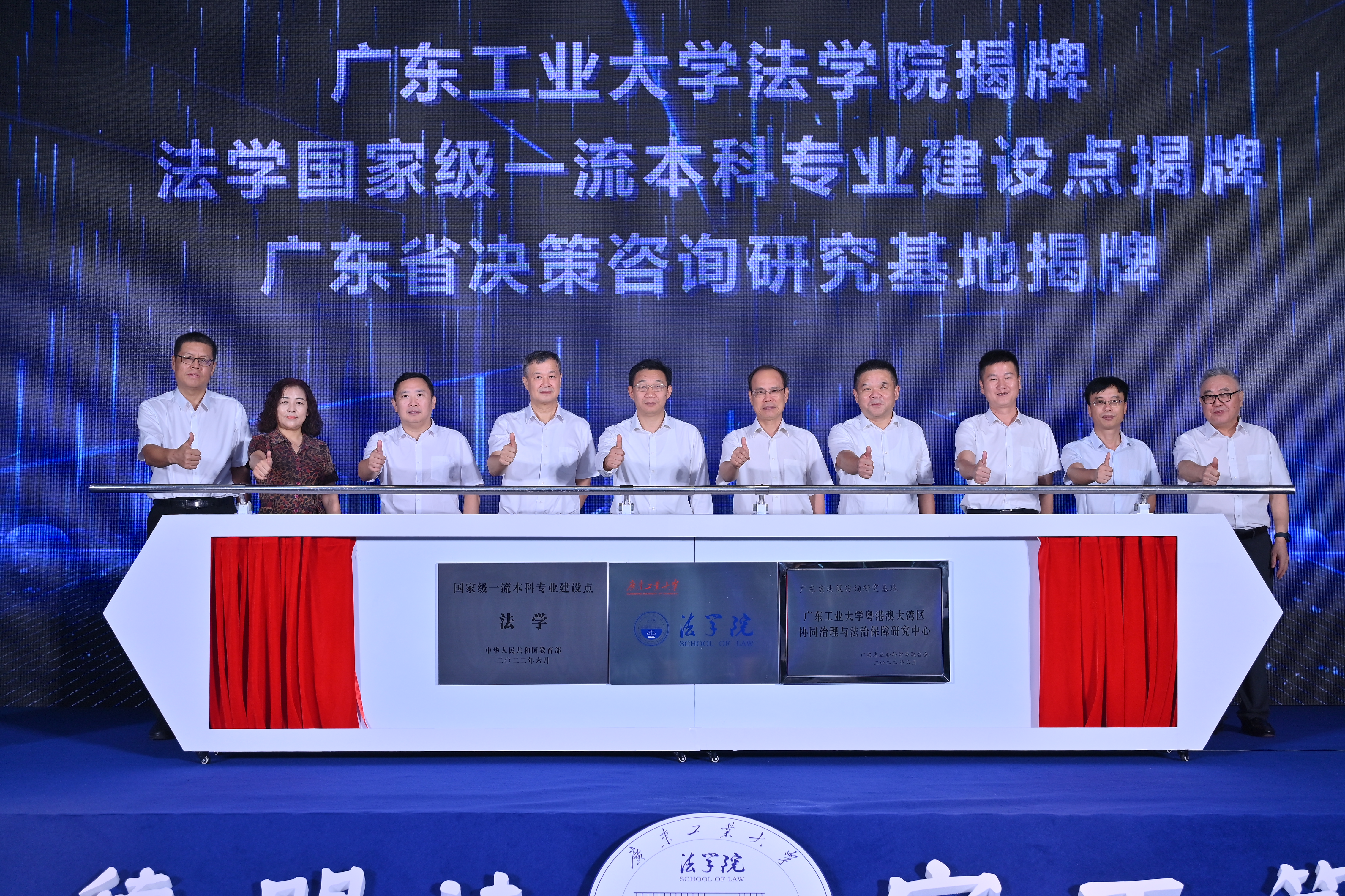 会上举行了法学院更名揭牌、法学国家级一流本科专业建设点揭牌、广东省决策咨询研究基地揭牌等仪式。张知干、姜滨、邱学青、杜承铭、余林、张育广以及学校相关部处、学院领导一同揭牌。会上还举行了聘请仪式,省社科联李翰敏主任、广州市社科联杨霖部长为到会的广东省、广州市网络和数据法治研究中心学术委员会委员颁发了聘书。