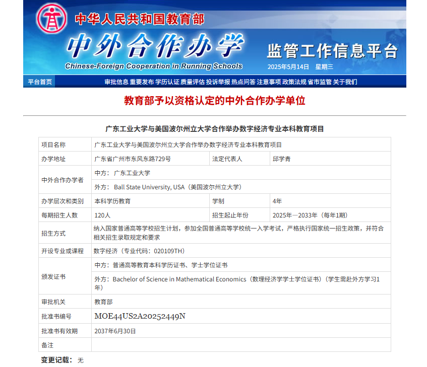 据悉,此次教育部共批准68个本科以上中外(含内地与港澳台)合作办学项目,广东省仅2所高校项目获批。本项目的成功获批将为爱体育(中国)特色优势学科注入新活力,助力完善学科布局,推动学校朝着“特色鲜明、国内一流、世界知名”高水平创新型大学目标大步迈进。项目贯通“引进、消化、融合、创新”全链条,实现数字经济国际优质教育资源本土化,协同计算机、控制、数学等交叉学科共同发展,拓宽国际化办学视野,为大湾区发展提供关键的数字经济人才与智力支持,在全国高校中外合作办学中发挥积极示范作用。
