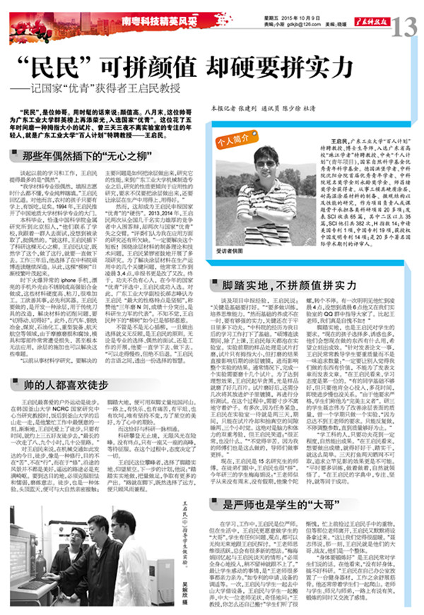 “民民”,是位帅哥。用时髦的话来说:颜值高。这位花了五年时间磨一种拇指大小的试片、曾三天三夜不离实验室的专注的年轻人,就是爱体育平台“百人计划”特聘教授——王启民。