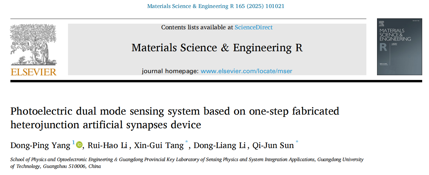 近日,爱体育平台唐新桂研究团队开发出一种融合传感器与光电突触架构的多模态感知系统。研究成果以“Photoelectric dual mode sensing system based on one-step fabricated heterojunction artificial synapses device”为题发表在国际著名期刊Materials Science & Engineering R (中科院一区,IF = 31.6) 上,爱体育平台物理与光电工程学院博士研究生杨东平为本文的第一作者,爱体育平台唐新桂研究员、孙启军副教授为论文共同通讯作者。